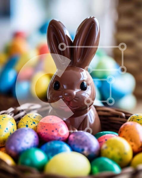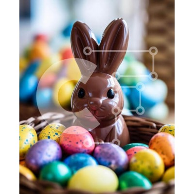 Υπάρχει δυνατότητα προσωποποίησης με δική σας φωτογραφία και προσαρμογής διαστάσεων κατόπιν παραγγελίας. Το συγεκεριμενο Puzzle 10x10 cm – 25 κομμ παρουσιαζει Αυτή η εικόνα παρουσιάζει ένα σοκολατένιο κουνελάκι που κάθεται στη μέση ενός πασχαλινού καλαθιού γεμάτο με πολύχρωμα αυγά. Υπάρχουν διάφοροι διαφορετικοί τύποι χρωματιστών αυγών, όπως κόκκινο, κίτρινο, πράσινο και μπλε, που το καθιστά ιδανι