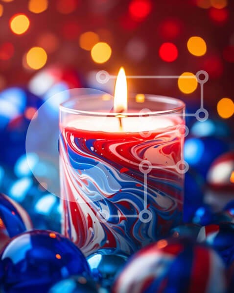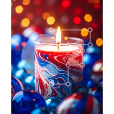 Υπάρχει δυνατότητα προσωποποίησης με δική σας φωτογραφία και προσαρμογής διαστάσεων κατόπιν παραγγελίας. Το συγεκεριμενο Puzzle 10x10 cm – 25 κομμ παρουσιαζει Η εικόνα δείχνει ένα κερί τοποθετημένο πάνω από κόκκινα, λευκά και μπλε στολίδια, δημιουργώντας μια εορταστική και πατριωτική επίδειξη. Το κερί, τοποθετημένο στο κέντρο, ξεχωρίζει έντονα στο πολύχρωμο φόντο. Είναι φωτισμένο, υποδηλώνοντας μι