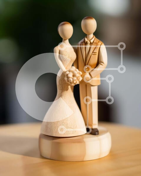 Υπάρχει δυνατότητα προσωποποίησης με δική σας φωτογραφία και προσαρμογής διαστάσεων κατόπιν παραγγελίας. Το συγεκεριμενο Puzzle 10x10 cm – 25 κομμ παρουσιαζει Η εικόνα δείχνει ένα ξύλινο κάλυμμα γαμήλιας τούρτας με δύο ειδώλια, που αναπαριστούν τη νύφη και τον γαμπρό πιασμένοι χέρι χέρι. Στέκονται πάνω σε μια άδεια ξύλινη βάση, συμβολίζοντας τη γιορτή του γάμου τους. Στο βάθος, ένα μικρό μπουκέτο