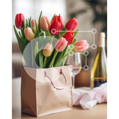 Υπάρχει δυνατότητα προσωποποίησης με δική σας φωτογραφία και προσαρμογής διαστάσεων κατόπιν παραγγελίας. Το συγεκεριμενο Puzzle 10x10 cm – 25 κομμ παρουσιαζει Αυτή η εικόνα παρουσιάζει μια χάρτινη σακούλα γεμάτη με κόκκινες και ροζ τουλίπες, καθώς και δύο ποτήρια κρασί σε ένα τραπέζι. Υπάρχει επίσης μια χαρτοπετσέτα, υποδηλώνοντας ότι τα λουλούδια μπορεί να έχουν αγοραστεί για τα γενέθλια ή την επ