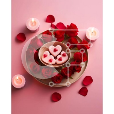 Υπάρχει δυνατότητα προσωποποίησης με δική σας φωτογραφία και προσαρμογής διαστάσεων κατόπιν παραγγελίας. Το συγεκεριμενο Puzzle 10x10 cm – 25 κομμ παρουσιαζει Αυτή η εικόνα παρουσιάζει ένα πιάτο στολισμένο με κόκκινα τριαντάφυλλα, κεριά και μπισκότα σε σχήμα καρδιάς, σε ρομαντικό στυλ για την Ημέρα του Αγίου Βαλεντίνου. Το πιάτο περιβάλλεται από διάσπαρτα ροζ ροδοπέταλα, δημιουργώντας μια οπτικά ε