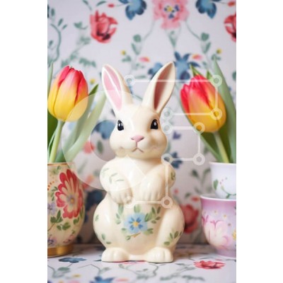 Υπάρχει δυνατότητα προσωποποίησης με δική σας φωτογραφία και προσαρμογής διαστάσεων κατόπιν παραγγελίας. Το συγεκεριμενο Puzzle 10x10 cm – 25 κομμ παρουσιαζει Αυτή η εικόνα παρουσιάζει ένα λευκό ειδώλιο κουνελιού που περιβάλλεται από πολύχρωμα βάζα, κύπελλα και μπολ, πιθανότατα μέρος μιας γιορτής του Πάσχα. Η σκηνή είναι διακοσμημένη με έντονα χρώματα και floral μοτίβα, δημιουργώντας μια γιορτινή