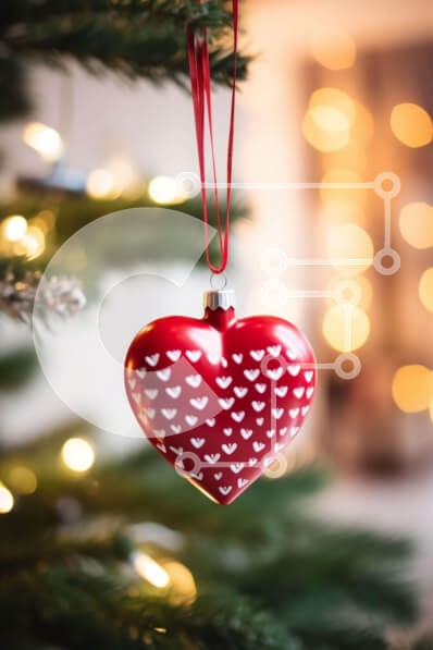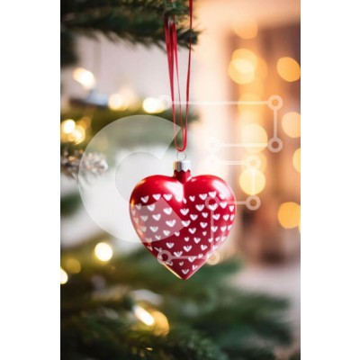 Υπάρχει δυνατότητα προσωποποίησης με δική σας φωτογραφία και προσαρμογής διαστάσεων κατόπιν παραγγελίας. Το συγεκεριμενο Puzzle 10x10 cm – 25 κομμ παρουσιαζει Αυτή η εικόνα παρουσιάζει ένα κόκκινο στολίδι σε σχήμα καρδιάς που κρέμεται από ένα χριστουγεννιάτικο δέντρο. Το στολίδι φαίνεται στο πρώτο πλάνο, υποδηλώνοντας ότι είναι μέρος μιας διακοσμητικής οθόνης. Το δέντρο είναι στολισμένο με άλλα δι