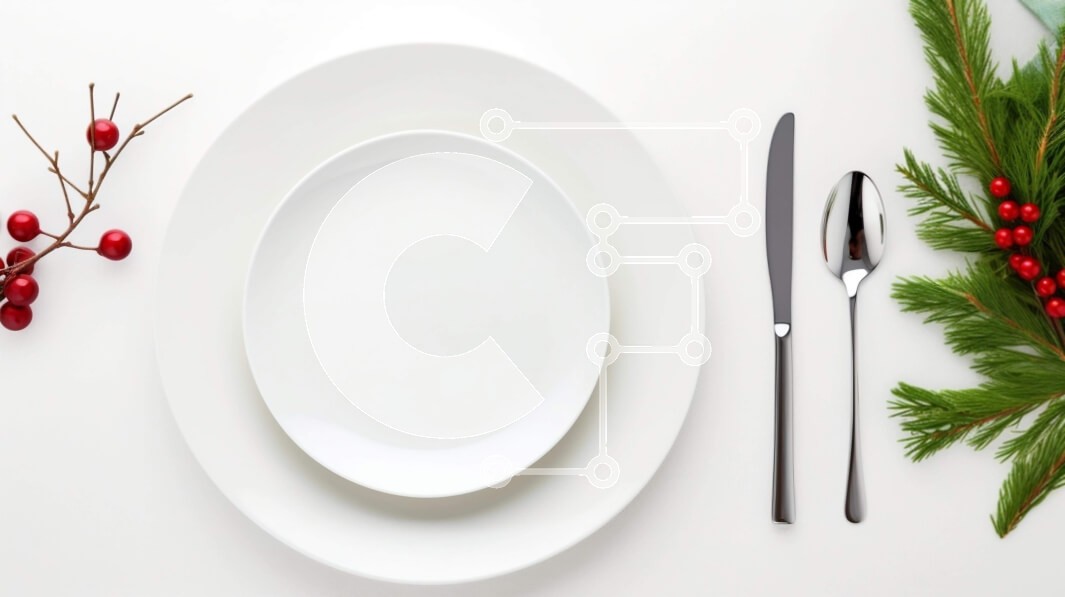 Υπάρχει δυνατότητα προσωποποίησης με δική σας φωτογραφία και προσαρμογής διαστάσεων κατόπιν παραγγελίας. Το συγεκεριμενο Puzzle 10x10 cm – 25 κομμ παρουσιαζει Αυτή η εικόνα παρουσιάζει ένα εορταστικό εορταστικό τραπέζι. Περιλαμβάνει ένα άδειο πιάτο, ένα πιρούνι, ένα μαχαίρι και ένα κλαδί πουρνάρι τοποθετημένο στη μέση του τραπεζιού. Πρόσθετα διακοσμητικά στοιχεία όπως κουκουνάρια και κόκκινα μούρα