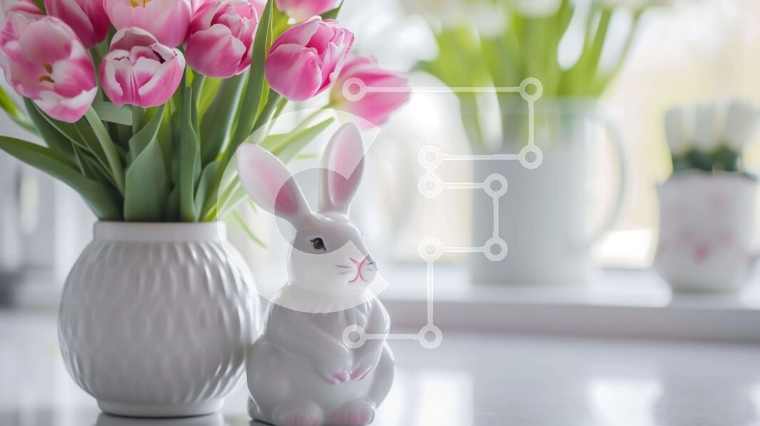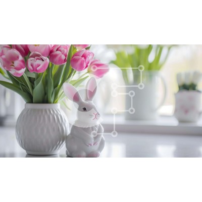 Υπάρχει δυνατότητα προσωποποίησης με δική σας φωτογραφία και προσαρμογής διαστάσεων κατόπιν παραγγελίας. Το συγεκεριμενο puzzle παρουσιαζει Η εικόνα απεικονίζει ένα λευκό κουνελάκι κουνέλι που κάθεται στη μέση δύο ροζ βάζα με τουλίπα. Υπάρχουν επίσης πολλά άλλα λουλούδια σε γλάστρες στο τραπέζι, όπως τριαντάφυλλα και νάρκισσους. Επιπλέον, υπάρχουν πολλά μικρά κύπελλα τοποθετημένα κοντά στο κουνέλι, τα οποία θα μπο