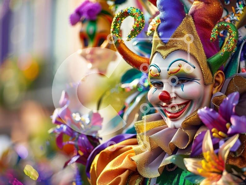 Υπάρχει δυνατότητα προσωποποίησης με δική σας φωτογραφία και προσαρμογής διαστάσεων κατόπιν παραγγελίας. Το συγεκεριμενο Puzzle 10x10 cm – 25 κομμ παρουσιαζει Η εικόνα παρουσιάζει μια πολύχρωμη μάσκα κλόουν διακοσμημένη με ζωντανές διακοσμήσεις, που ξεχωρίζει μέσα σε ένα φόντο από γιορτινά λουλούδια και πράσινο. Η μάσκα δείχνει ένα πλατύ χαμόγελο, με έντονα χρώματα και περίπλοκες λεπτομέρειες που