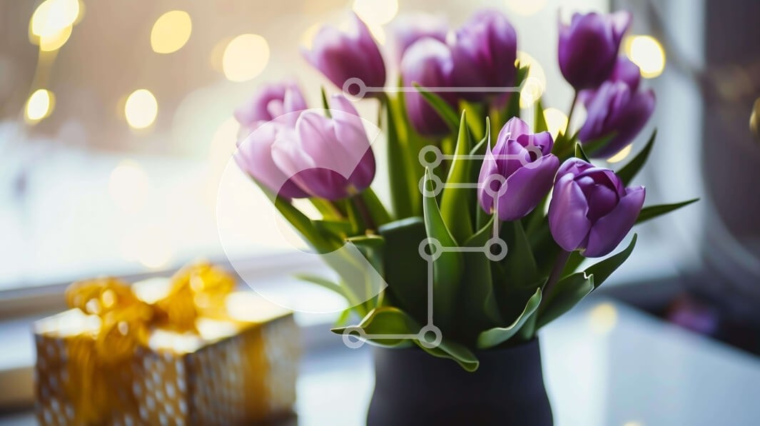 Υπάρχει δυνατότητα προσωποποίησης με δική σας φωτογραφία και προσαρμογής διαστάσεων κατόπιν παραγγελίας. Το συγεκεριμενο puzzle παρουσιαζει Η εικόνα παρουσιάζει ένα μαύρο βάζο γεμάτο με μοβ τουλίπες, τοποθετημένο σε ένα περβάζι παραθύρου. Ένα χρυσό κουτί δώρου κάθεται πάνω από το βάζο, προσθέτοντας ένα στοιχείο έκπληξης και απόλαυσης στη σκηνή. Ένα μοναδικό puzzle που συνδυάζει ποιότητα, αισθητική και εμπειρία.