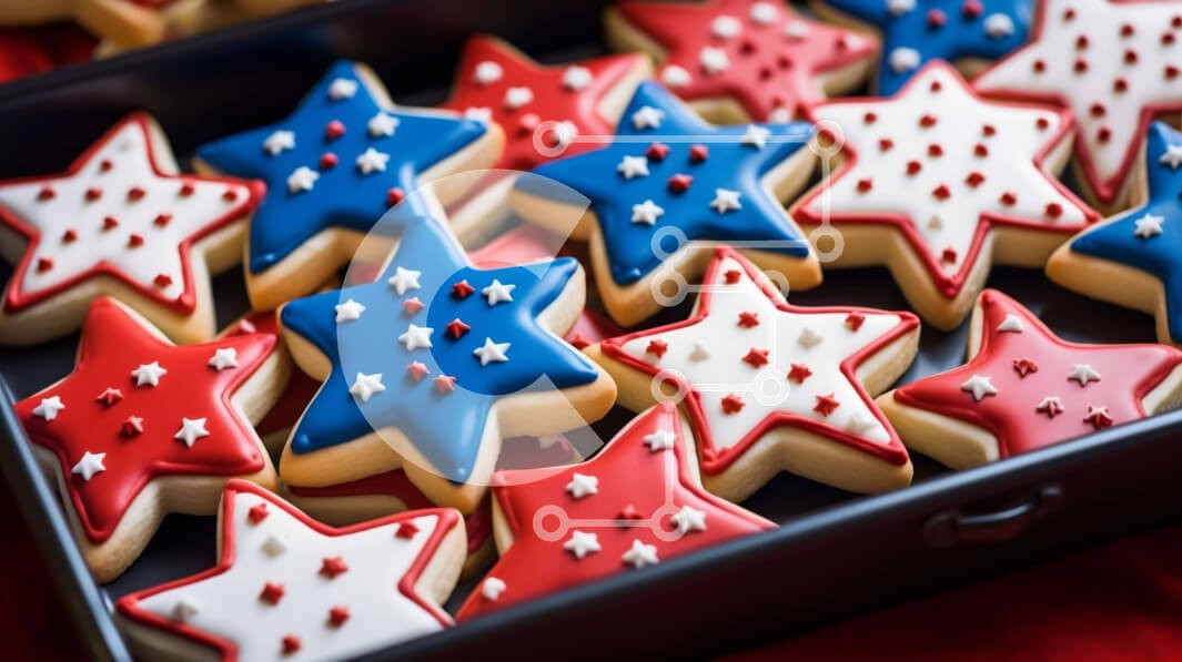 Υπάρχει δυνατότητα προσωποποίησης με δική σας φωτογραφία και προσαρμογής διαστάσεων κατόπιν παραγγελίας. Το συγεκεριμενο Puzzle 10x10 cm – 25 κομμ παρουσιαζει Η εικόνα δείχνει έναν δίσκο με μπισκότα σε σχήμα αστεριού στολισμένο με κόκκινο, λευκό και μπλε γλάσο. Αυτά τα πατριωτικά μπισκότα είναι τακτοποιημένα στο δίσκο, δημιουργώντας μια ζωντανή και εορταστική οθόνη κατάλληλη για τις διακοπές της 4
