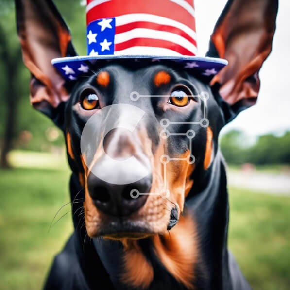 Υπάρχει δυνατότητα προσωποποίησης με δική σας φωτογραφία και προσαρμογής διαστάσεων κατόπιν παραγγελίας. Το συγεκεριμενο Puzzle 10x10 cm – 25 κομμ παρουσιαζει Η εικόνα δείχνει έναν μαύρο και καφέ σκύλο ντόμπερμαν που φορά ένα καπέλο σε σχήμα αμερικανικής σημαίας, πιθανότατα να γιορτάζει την 4η Ιουλίου σε εξωτερικούς χώρους. Ο σκύλος στέκεται σε μια περιοχή με γρασίδι, με πιθανώς άλλους ανθρώπους ή