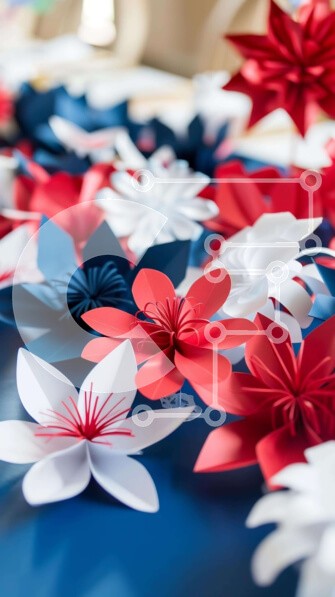 Υπάρχει δυνατότητα προσωποποίησης με δική σας φωτογραφία και προσαρμογής διαστάσεων κατόπιν παραγγελίας. Το συγεκεριμενο puzzle παρουσιαζει Η εικόνα δείχνει ένα τραπέζι στολισμένο με κόκκινα, λευκά και μπλε χάρτινα λουλούδια σε διάφορα σχήματα και μεγέθη. Στο τραπέζι υπάρχουν και μικρά φλιτζάνια, που πιθανώς προορίζονται για τη συγκράτηση των λουλουδιών. Η σκηνή είναι γιορτινά διακοσμημένη για τις 4 Ιουλίου, δημιο