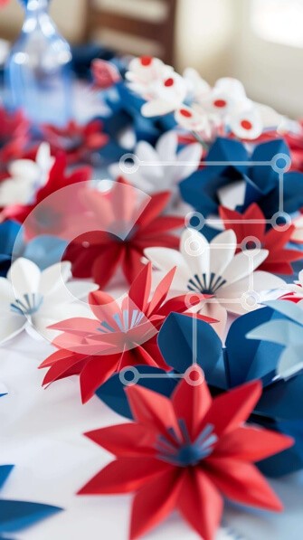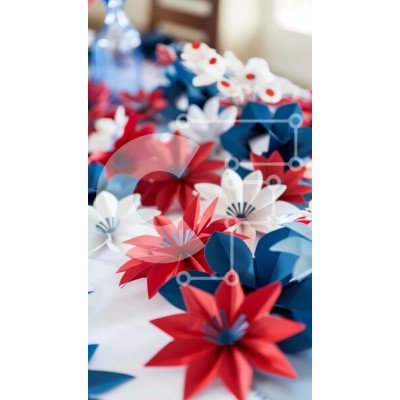 Υπάρχει δυνατότητα προσωποποίησης με δική σας φωτογραφία και προσαρμογής διαστάσεων κατόπιν παραγγελίας. Το συγεκεριμενο puzzle παρουσιαζει Η εικόνα παρουσιάζει ένα τραπέζι γεμάτο με κόκκινα, λευκά και μπλε χάρτινα λουλούδια που έχουν τοποθετηθεί στην κορυφή του τραπεζιού. Υπάρχουν επίσης πολλά μπουκάλια νερό σε κοντινή απόσταση, τα οποία θα μπορούσαν να χρησιμοποιηθούν για να σερβίρουν ποτά ή ποτά. Συνολικά, η σκ