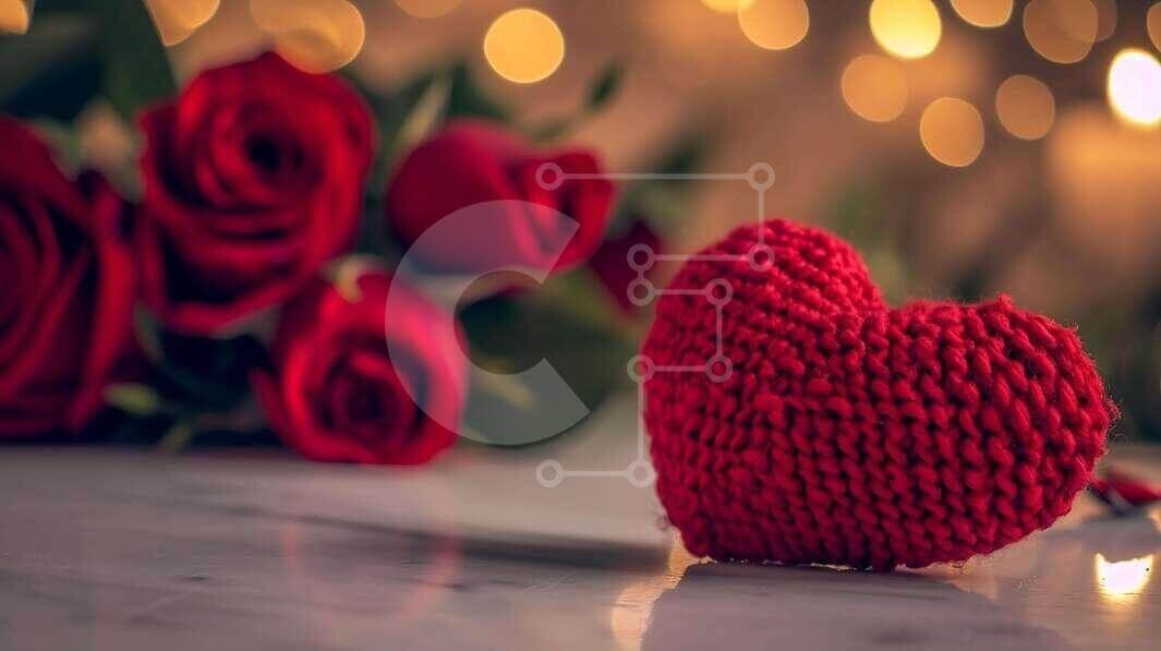 Υπάρχει δυνατότητα προσωποποίησης με δική σας φωτογραφία και προσαρμογής διαστάσεων κατόπιν παραγγελίας. Το συγεκεριμενο puzzle παρουσιαζει Η εικόνα παρουσιάζει μια όμορφα πλεκτή κόκκινη καρδιά στο πρώτο πλάνο, που στηρίζεται σε μια ανακλαστική επιφάνεια. Πίσω του, υπάρχει ένα μπουκέτο με κόκκινα τριαντάφυλλα, δημιουργώντας μια ρομαντική ατμόσφαιρα. Τα ζεστά φώτα bokeh παρέχουν μια απαλή λάμψη στο φόντο, ενισχύοντ