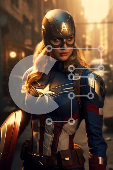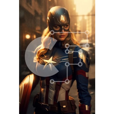 Υπάρχει δυνατότητα προσωποποίησης με δική σας φωτογραφία και προσαρμογής διαστάσεων κατόπιν παραγγελίας. Το συγεκεριμενο puzzle παρουσιαζει Αυτή η εικόνα παρουσιάζει μια γυναίκα ντυμένη με στολή Captain America να στέκεται σε έναν δρόμο της πόλης κατά τη διάρκεια του ηλιοβασιλέματος. Φοράει ένα μπλε και κόκκινο κοστούμι με ένα άσπρο έμβλημα στο στήθος και μια κόκκινη κάπα να κυλά πίσω της. Τα μαλλιά της είναι χτεν