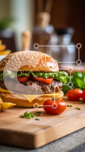 Υπάρχει δυνατότητα προσωποποίησης με δική σας φωτογραφία και προσαρμογής διαστάσεων κατόπιν παραγγελίας. Το συγεκεριμενο Puzzle 10x10 cm – 25 κομμ παρουσιαζει Αυτή η εικόνα παρουσιάζει ένα νόστιμο cheeseburger με φρέσκο μαρούλι και ντομάτα, που σερβίρεται δίπλα σε χρυσές τηγανητές πατάτες σε ξύλινο ξύλο κοπής. Το μπιφτέκι είναι ζουμερό και άψογα μαγειρεμένο, με λιωμένο τυρί να ξεχύνεται ανάμεσα