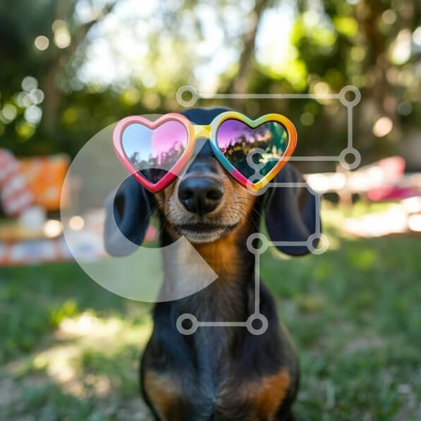 Υπάρχει δυνατότητα προσωποποίησης με δική σας φωτογραφία και προσαρμογής διαστάσεων κατόπιν παραγγελίας. Το συγεκεριμενο Puzzle 10x10 cm – 25 κομμ παρουσιαζει Ένας σκύλος dachshund φοράει πολύχρωμα γυαλιά ηλίου σε σχήμα καρδιάς, κάθεται σε έναν καταπράσινο κήπο. Ο σκύλος φαίνεται χαρούμενος και χαλαρός, με το φως του ήλιου να περνάει μέσα από τα δέντρα στο βάθος. Τα ζωηρά χρώματα των γυαλιών ηλίου