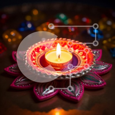 Υπάρχει δυνατότητα προσωποποίησης με δική σας φωτογραφία και προσαρμογής διαστάσεων κατόπιν παραγγελίας. Το συγεκεριμενο Puzzle 10x10 cm – 25 κομμ παρουσιαζει Η εικόνα δείχνει ένα αναμμένο κερί τοποθετημένο σε ζωντανούς πολύτιμους λίθους και διακοσμητικά αντικείμενα, παραπέμποντας στο εορταστικό πνεύμα του Diwali, μιας σημαντικής ινδουιστικής γιορτής. Γύρω από το κερί υπάρχουν μικρά κοσμήματα, ενι