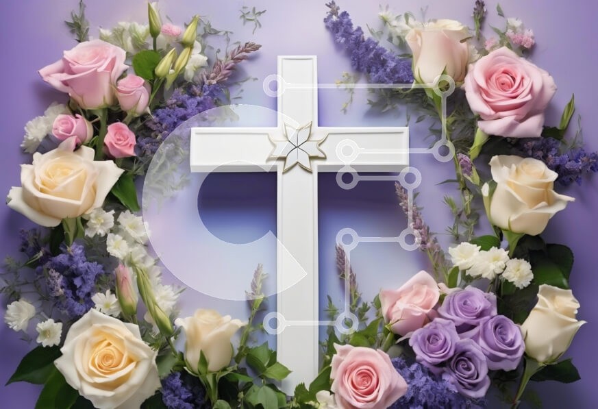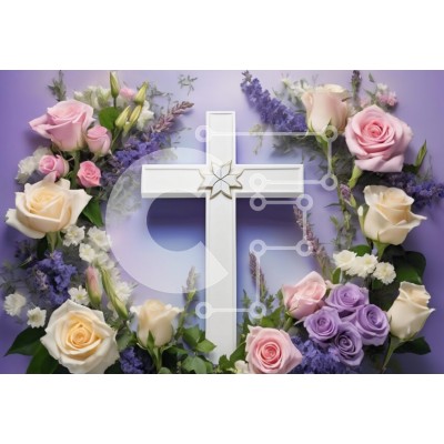 Υπάρχει δυνατότητα προσωποποίησης με δική σας φωτογραφία και προσαρμογής διαστάσεων κατόπιν παραγγελίας. Το συγεκεριμενο puzzle παρουσιαζει Η εικόνα παρουσιάζει έναν λευκό σταυρό σε ένα απαλό μοβ φόντο, που περιβάλλεται από μια ποικιλία από όμορφα λουλούδια. Διάφορες αποχρώσεις τριαντάφυλλων, όπως ροζ, λεβάντας και κρεμ, μαζί με άλλα ευαίσθητα άνθη δημιουργούν μια γαλήνια και γαλήνια ατμόσφαιρα. Η floral σύνθεση π