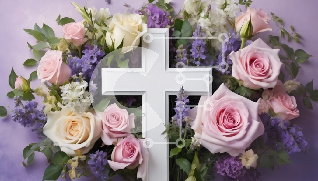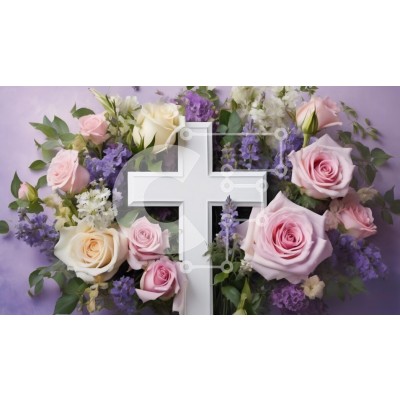 Υπάρχει δυνατότητα προσωποποίησης με δική σας φωτογραφία και προσαρμογής διαστάσεων κατόπιν παραγγελίας. Το συγεκεριμενο puzzle παρουσιαζει Η εικόνα δείχνει μια όμορφη διάταξη λουλουδιών που περιβάλλουν έναν λευκό σταυρό. Απαλά ροζ και κρεμ τριαντάφυλλα, μαζί με μοβ και λευκά άνθη, δημιουργούν μια γαλήνια και σεβαστή ατμόσφαιρα. Τα λουλούδια είναι επιδέξια τακτοποιημένα, προσθέτοντας μια πινελιά κομψότητας στη σκη