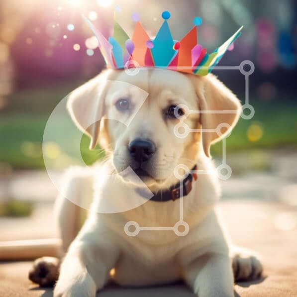 Υπάρχει δυνατότητα προσωποποίησης με δική σας φωτογραφία και προσαρμογής διαστάσεων κατόπιν παραγγελίας. Το συγεκεριμενο Puzzle 10x10 cm – 25 κομμ παρουσιαζει Αυτή η εικόνα παρουσιάζει ένα χαριτωμένο κουτάβι Λαμπραντόρ Ριτρίβερ που φορά ένα πολύχρωμο καπέλο γενεθλίων. Το κουτάβι είναι ξαπλωμένο στο έδαφος και κοιτάζει την κάμερα με μια χαρούμενη έκφραση. Το φόντο δείχνει δέντρα και έναν γαλάζιο ου