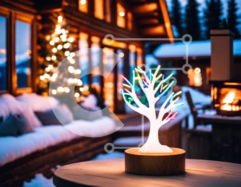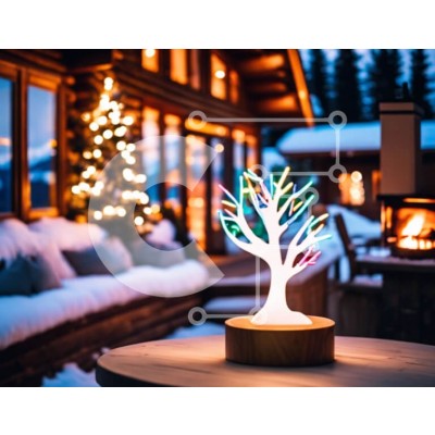 Υπάρχει δυνατότητα προσωποποίησης με δική σας φωτογραφία και προσαρμογής διαστάσεων κατόπιν παραγγελίας. Το συγεκεριμενο puzzle παρουσιαζει Αυτή η εικόνα παρουσιάζει μια λάμπα σε σχήμα δέντρου τοποθετημένη πάνω από ένα τραπέζι εξωτερικού χώρου σε ένα χιονισμένο περιβάλλον. Το φωτιστικό είναι διακοσμημένο με πολύχρωμα φώτα LED, παρέχοντας μια ζωντανή και εορταστική ατμόσφαιρα. Πολλές καρέκλες είναι τοποθετημένες γύ