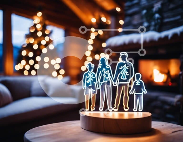 Υπάρχει δυνατότητα προσωποποίησης με δική σας φωτογραφία και προσαρμογής διαστάσεων κατόπιν παραγγελίας. Το συγεκεριμενο puzzle παρουσιαζει Αυτή η εικόνα παρουσιάζει ένα οικογενειακό γλυπτό φωτός LED τοποθετημένο πάνω από μια διακοσμητική ξύλινη βάση σε ένα άνετο σαλόνι. Το γλυπτό φωτίζεται με κόκκινα και πράσινα φώτα, υποδηλώνοντας μια εορταστική ατμόσφαιρα, πιθανώς για την παραμονή των Χριστουγέννων ή της Πρωτοχ