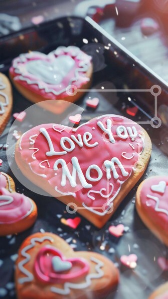 Υπάρχει δυνατότητα προσωποποίησης με δική σας φωτογραφία και προσαρμογής διαστάσεων κατόπιν παραγγελίας. Το συγεκεριμενο Puzzle 10x10 cm – 25 κομμ παρουσιαζει Η εικόνα δείχνει έναν δίσκο με όμορφα διακοσμημένα μπισκότα με το μήνυμα "love you mom" πάνω τους. Τα μπισκότα ακουμπάνε σε έναν άλλο δίσκο στολισμένο με παγέτα και διακοσμητικά καρδιάς. Ποικιλίες μπισκότων όπως σοκολάτα, βανίλια και κόκκινο