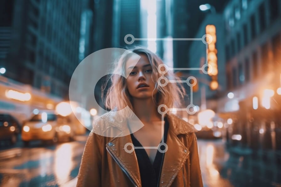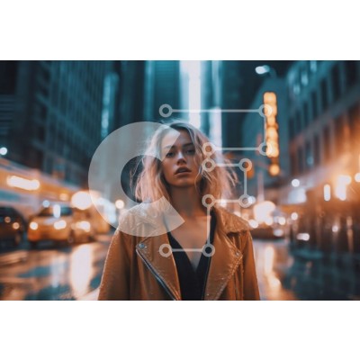 Υπάρχει δυνατότητα προσωποποίησης με δική σας φωτογραφία και προσαρμογής διαστάσεων κατόπιν παραγγελίας. Το συγεκεριμενο puzzle παρουσιαζει Αυτή η εικόνα απεικονίζει μια νεαρή γυναίκα να στέκεται σε έναν δρόμο της πόλης τη νύχτα. Φοράει δερμάτινο μπουφάν και σκούρα γυαλιά ηλίου και έχει μακριά ξανθά μαλλιά. Το επίκεντρο της εικόνας είναι το πρόσωπό της και το αστικό τοπίο στο βάθος, το οποίο φωτίζεται από τα φώτα