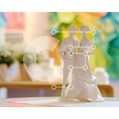 Υπάρχει δυνατότητα προσωποποίησης με δική σας φωτογραφία και προσαρμογής διαστάσεων κατόπιν παραγγελίας. Το συγεκεριμενο puzzle παρουσιαζει Η εικόνα παρουσιάζει ένα γλυπτό origami ενός άνδρα και μιας γυναίκας που στέκονται ο ένας δίπλα στον άλλο. Το ζευγάρι είναι ντυμένο με λευκά ρούχα, υποδηλώνοντας ότι είναι αρραβωνιασμένοι ή πρόσφατα παντρεύτηκαν. Στο τραπέζι υπάρχουν πολλά φυτά σε γλάστρες, τα οποία θα μπορούσ