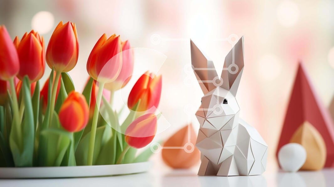 Υπάρχει δυνατότητα προσωποποίησης με δική σας φωτογραφία και προσαρμογής διαστάσεων κατόπιν παραγγελίας. Το συγεκεριμενο puzzle παρουσιαζει Αυτή η εικόνα παρουσιάζει ένα κουνέλι origami που κάθεται δίπλα σε ένα βάζο με τουλίπες, καθώς και άλλα διακοσμητικά αντικείμενα, όπως αυγά και ειδώλια. Το κουνελάκι τοποθετείται στη μέση του τραπεζιού, υποδηλώνοντας ότι μπορεί να είναι μέρος μιας έκθεσης με θέμα το Πάσχα. Επι