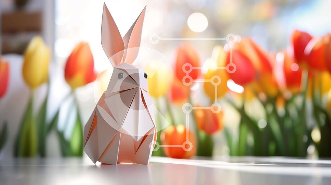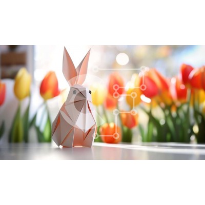 Υπάρχει δυνατότητα προσωποποίησης με δική σας φωτογραφία και προσαρμογής διαστάσεων κατόπιν παραγγελίας. Το συγεκεριμενο puzzle παρουσιαζει Η εικόνα δείχνει ένα κουνέλι origami να κάθεται σε ένα τραπέζι μπροστά από πολύχρωμες τουλίπες. Το λαγουδάκι είναι κατασκευασμένο από χαρτί, που το καθιστά ελαφρύ και εύκολο στη μεταφορά. Μπορεί να χρησιμοποιηθεί ως διακόσμηση για το Πάσχα ή άλλες γιορτές, όπως την άνοιξη ή το