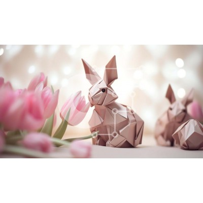 Υπάρχει δυνατότητα προσωποποίησης με δική σας φωτογραφία και προσαρμογής διαστάσεων κατόπιν παραγγελίας. Το συγεκεριμενο puzzle παρουσιαζει Αυτή η εικόνα παρουσιάζει τρία κουνέλια origami να κάθονται σε ένα τραπέζι με ροζ τουλίπες στο φόντο. Τα κουνελάκια είναι κατασκευασμένα από χαρτί, καθιστώντας τα ελαφριά και εύκολα στη μεταφορά. Θα μπορούσαν να χρησιμοποιηθούν ως διακοσμητικά για ένα πάρτι ή γιορτή με θέμα το