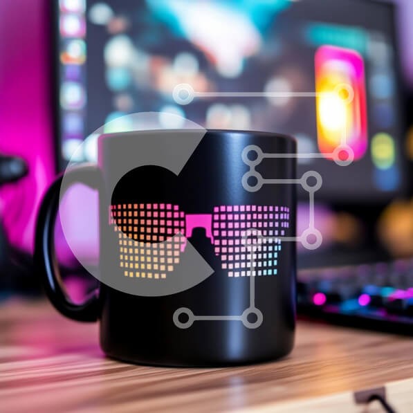 Περιγραφή εικόνας & κατασκευής: Το Puzzle 10x10 cm – 25 κομμπαρουσιάζει μια υψηλής ευκρίνειας εικόνα με εξαιρετική λεπτομέρεια και ζωντανά χρώματα. Κατασκευάζεται από ανθεκτικό φυσικό ξύλο, με κομμάτια κομμένα με laser για τέλειο ταίριασμα. Η ξυλεία είναι προσεγμένη και άριστης ποιότητας, ενώ η εκτύπωση ολοκληρώνεται με γυαλιστερή υφή και προστατευτικό βερνίκι. Παραλαβή: Το προϊόν παραδίδεται σε στιβαρό ξύλινο κουτί σε χρώμα wenge, έτοιμο για χρήση ή ως δώρο. Η παραγγελία αποστέλλεται απευθείας από την παραγωγή στον καταναλωτή, εξασφαλίζοντας φρεσκάδα, ποιότητα και άμεση διαθεσιμότητα. Υπάρχει δυνατότητα προσωποποίησης με δική σας φωτογραφία και προσαρμογής διαστάσεων κατόπιν παραγγελίας. Το συγεκεριμενο Puzzle 10x10 cm – 25 κομμ παρουσιαζει Η εικόνα διαθέτει μια κομψή μαύρη κούπα με σχέδιο γυαλιών ηλίου με pixel σε ζωηρά ντεγκραντέ χρώματα. Η κούπα είναι τοποθετημένη σε μια ξύλινη επιφάνεια, με μια θολή οθόνη υπολογιστή στο φόντο που εμφανίζει πολύχρωμα γραφικά. Η σκηνή είναι κ