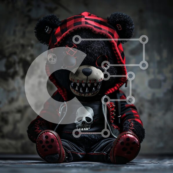 Υπάρχει δυνατότητα προσωποποίησης με δική σας φωτογραφία και προσαρμογής διαστάσεων κατόπιν παραγγελίας. Το συγεκεριμενο Puzzle 10x10 cm – 25 κομμ παρουσιαζει Αυτή η εικόνα παρουσιάζει ένα στυλιζαρισμένο βελούδινο παιχνίδι αρκούδας με πανκ αισθητική. Η αρκούδα είναι ντυμένη με μια κόκκινη και μαύρη καρό κουκούλα και έχει μια απαίσια έκφραση, με κοφτερά δόντια και μαυρισμένα μάτια. Η στολή περιλαμβ