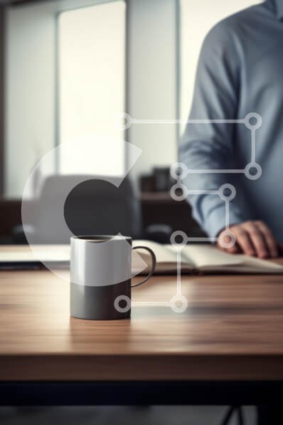 Υπάρχει δυνατότητα προσωποποίησης με δική σας φωτογραφία και προσαρμογής διαστάσεων κατόπιν παραγγελίας. Το συγεκεριμενο puzzle παρουσιαζει Η εικόνα απεικονίζει μια κούπα καφέ τοποθετημένη σε ένα ξύλινο τραπέζι σε ένα περιβάλλον γραφείου. Το φόντο παρουσιάζει μια θολή φιγούρα ενός ατόμου που στέκεται δίπλα σε ένα ανοιχτό σημειωματάριο, υποδηλώνοντας ένα επαγγελματικό περιβάλλον. Ο απαλός φωτισμός που προέρχεται απ