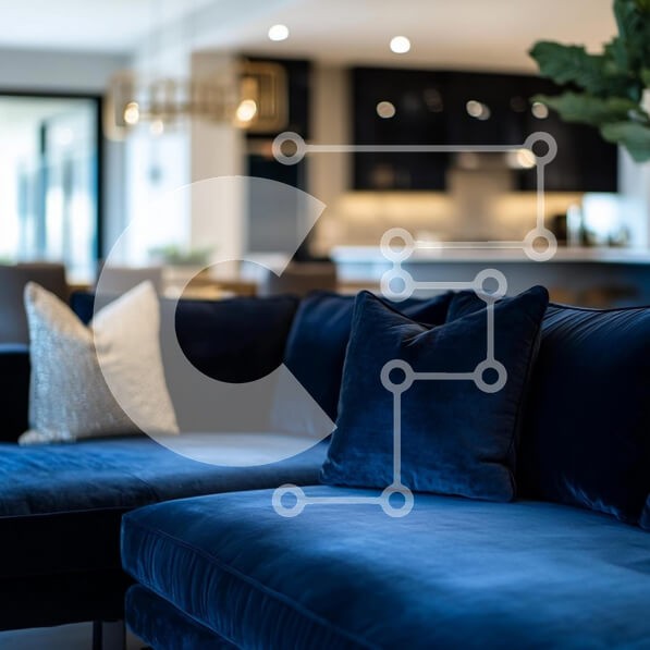 Υπάρχει δυνατότητα προσωποποίησης με δική σας φωτογραφία και προσαρμογής διαστάσεων κατόπιν παραγγελίας. Το συγεκεριμενο puzzle παρουσιαζει Η εικόνα παρουσιάζει έναν όμορφα σχεδιασμένο χώρο διαβίωσης με έναν μπλε ναυτικό βελούδινο καναπέ διακοσμημένο με βελούδινα μαξιλάρια. Το φόντο αποκαλύπτει έναν μοντέρνο χώρο κουζίνας με σκούρα ντουλάπια, έντονο φωτισμό και κομψά διακοσμητικά στοιχεία. Η συνολική ατμόσφαιρα εί