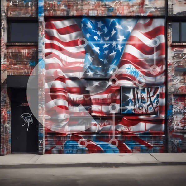 | Όνομα Προϊόντος | Intra Συλλεκτικό Ξύλινο Παζλ Plywood 4mm - Αμερικανική σημαία ζωγραφισμένη σε κτήριο από τούβλα με γκράφιτι Σε Ξύλινο Κουτί - Διαστάσεις Puzzle: 10x10 cm – 25 κομμάτια |