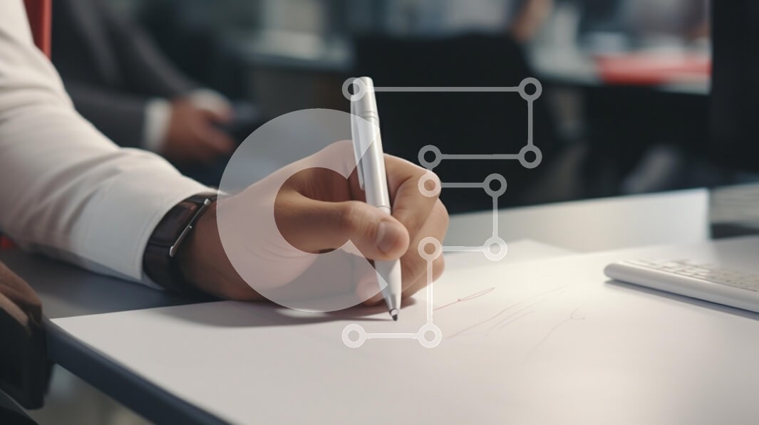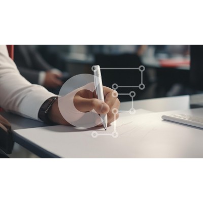 Υπάρχει δυνατότητα προσωποποίησης με δική σας φωτογραφία και προσαρμογής διαστάσεων κατόπιν παραγγελίας. Το συγεκεριμενο puzzle παρουσιαζει Αυτή η εικόνα απεικονίζει ένα κοντινό πλάνο ενός χεριού ενός ατόμου που κρατά ένα λευκό στυλό, έτοιμο να γράψει σε ένα λευκό φύλλο χαρτιού. Το χέρι ακουμπάει σε ένα γραφείο και στο βάθος υπάρχουν θολές φιγούρες ανθρώπων σε περιβάλλον γραφείου, υποδηλώνοντας μια ατμόσφαιρα παρα