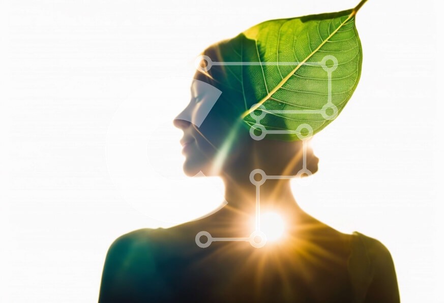 Υπάρχει δυνατότητα προσωποποίησης με δική σας φωτογραφία και προσαρμογής διαστάσεων κατόπιν παραγγελίας. Το συγεκεριμενο puzzle παρουσιαζει Αυτή η εικόνα δείχνει μια σιλουέτα μιας γυναίκας με το κεφάλι της γερμένο προς τον ήλιο. Φοράει μια φιλική προς το περιβάλλον ή βιώσιμη στολή, που συμβολίζεται από ένα πράσινο φύλλο στην κορυφή του κεφαλιού της. Το φως από τον ήλιο λάμπει μέσα από το φύλλο, αντιπροσωπεύοντας τ