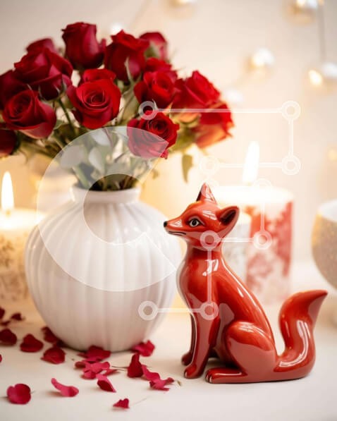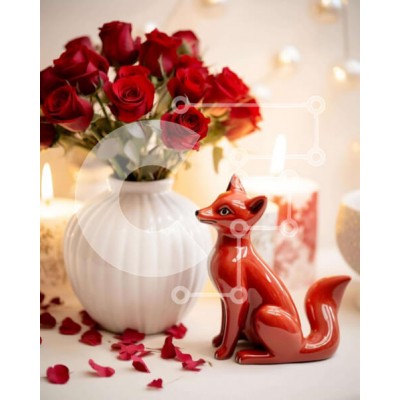 Υπάρχει δυνατότητα προσωποποίησης με δική σας φωτογραφία και προσαρμογής διαστάσεων κατόπιν παραγγελίας. Το συγεκεριμενο puzzle παρουσιαζει Αυτή η εικόνα παρουσιάζει ένα ειδώλιο κόκκινης αλεπούς που κάθεται μπροστά από μια διάταξη από τριαντάφυλλα και κεριά. Το βάζο είναι γεμάτο λουλούδια, προσθέτοντας στη ρομαντική ατμόσφαιρα. Πολλά κηροπήγια είναι διάσπαρτα γύρω από το τραπέζι, ενισχύοντας τη συνολική ρομαντική
