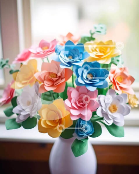 Υπάρχει δυνατότητα προσωποποίησης με δική σας φωτογραφία και προσαρμογής διαστάσεων κατόπιν παραγγελίας. Το συγεκεριμενο puzzle παρουσιαζει Αυτή η εικόνα παρουσιάζει ένα λευκό βάζο γεμάτο με μια ποικιλία από πολύχρωμα λουλούδια από χαρτί, όπως τριαντάφυλλα, γαρίφαλα, μαργαρίτες και ηλίανθους. Μερικά από τα λουλούδια φαίνεται να είναι χειροποίητα, ενώ άλλα μοιάζουν σαν να φτιάχτηκαν χρησιμοποιώντας προκατασκευασμέν