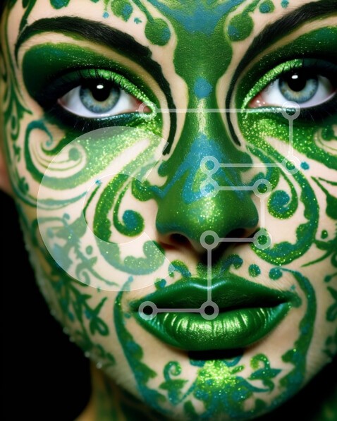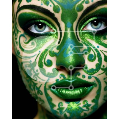 Υπάρχει δυνατότητα προσωποποίησης με δική σας φωτογραφία και προσαρμογής διαστάσεων κατόπιν παραγγελίας. Το συγεκεριμενο puzzle παρουσιαζει Αυτή η εικόνα παρουσιάζει μια γυναίκα με πράσινη μπογιά προσώπου και ένα λουλουδάτο σχέδιο στο μάγουλό της. Η βαφή είναι καλά λεπτομερής και τα χρώματα είναι ζωντανά, δημιουργώντας μια πραγματικά εντυπωσιακή εικόνα. Αυτό θα μπορούσε να λειτουργήσει για έργα ομορφιάς ή μόδας ή