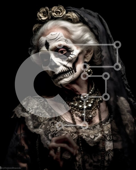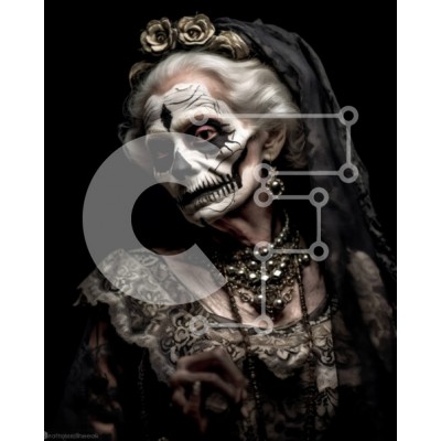 Υπάρχει δυνατότητα προσωποποίησης με δική σας φωτογραφία και προσαρμογής διαστάσεων κατόπιν παραγγελίας. Το συγεκεριμενο puzzle παρουσιαζει Αυτή η εικόνα απεικονίζει μια ηλικιωμένη γυναίκα στολισμένη με γοτθικό φόρεμα και μοναδική κόμμωση και κοσμήματα με θέμα το κρανίο. Το μακιγιάζ της συμπληρώνει το ντύσιμό της, αποπνέοντας μια αίσθηση αυτοπεποίθησης και ατομικότητας. Η εικόνα είναι ιδανική για κάθε έργο που σχε