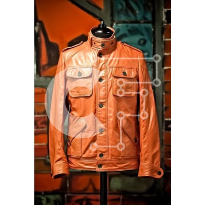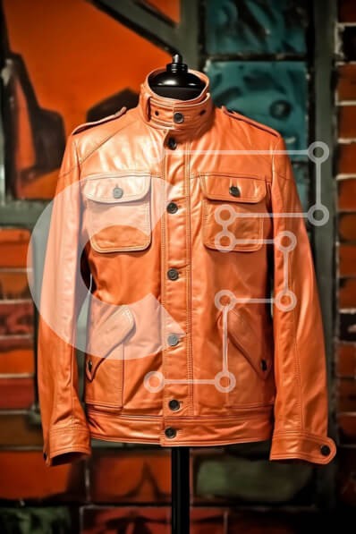 Υπάρχει δυνατότητα προσωποποίησης με δική σας φωτογραφία και προσαρμογής διαστάσεων κατόπιν παραγγελίας. Το συγεκεριμενο puzzle παρουσιαζει Αυτή η εικόνα παρουσιάζει ένα πορτοκαλί δερμάτινο μπουφάν σε ένα μανεκέν. Το σακάκι έχει γιακά, κλείσιμο με φερμουάρ και δύο μπροστινές τσέπες. Τα μανίκια είναι μακριά με φερμουάρ στις μανσέτες. Το σακάκι έχει ίσιο κόψιμο και δεν έχει φόδρα. Μια ετικέτα στο σακάκι γράφει «Πορτ
