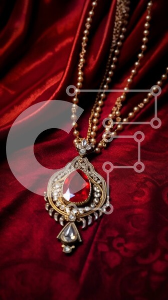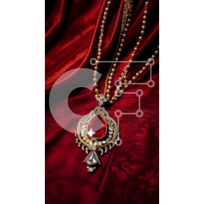 Υπάρχει δυνατότητα προσωποποίησης με δική σας φωτογραφία και προσαρμογής διαστάσεων κατόπιν παραγγελίας. Το συγεκεριμενο puzzle παρουσιαζει Αυτή η εικόνα δείχνει μια κοντινή όψη ενός κόκκινου οβάλ σχήματος μενταγιόν πολύτιμων λίθων με λεία, γυαλιστερή επιφάνεια. Κρεμιέται από μια χρυσή αλυσίδα με μικρά μαργαριτάρια διάσπαρτα σε όλο το μήκος του, ντυμένα σε ένα κόκκινο μεταξωτό ύφασμα. Η αντίθεση ανάμεσα στο πλούσι