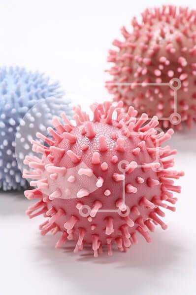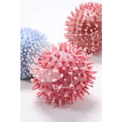 Υπάρχει δυνατότητα προσωποποίησης με δική σας φωτογραφία και προσαρμογής διαστάσεων κατόπιν παραγγελίας. Το συγεκεριμενο puzzle παρουσιαζει Η εικόνα παρουσιάζει τρεις πολύχρωμες αναπαραστάσεις δομών που μοιάζουν με ιούς, συμπεριλαμβανομένου ενός ροζ στο προσκήνιο, ενός μπεζ στο πίσω μέρος και ενός μπλε στα αριστερά. Αυτά τα μοντέλα διαθέτουν πολλές προεξοχές που μοιάζουν με ακίδες, δίνοντάς τους μια ανάγλυφη και λ