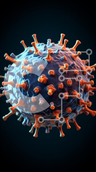 Υπάρχει δυνατότητα προσωποποίησης με δική σας φωτογραφία και προσαρμογής διαστάσεων κατόπιν παραγγελίας. Το συγεκεριμενο puzzle παρουσιαζει Αυτή η εικόνα απεικονίζει μια κοντινή άποψη ενός ιού, που δείχνει την περίπλοκη και πολύχρωμη δομή του. Ο ιός έχει σφαιρικό σχήμα, με αιχμές να προεξέχουν από την επιφάνειά του, που τονίζονται με ζωηρό πορτοκαλί σε μπλε φόντο. Οι λεπτομέρειες του ιού αποδίδονται σε υψηλή ανάλυ