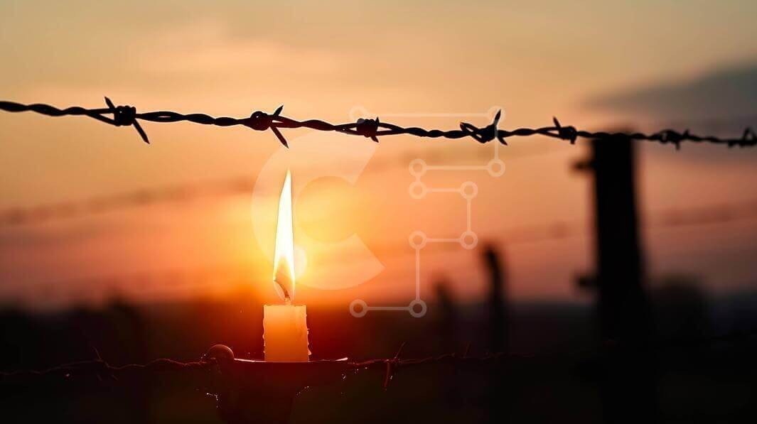Υπάρχει δυνατότητα προσωποποίησης με δική σας φωτογραφία και προσαρμογής διαστάσεων κατόπιν παραγγελίας. Το συγεκεριμενο puzzle παρουσιαζει Η εικόνα παρουσιάζει ένα αναμμένο κερί με φόντο ένα ηλιοβασίλεμα, με συρματοπλέγματα σε πρώτο πλάνο. Η φλόγα του κεριού τρεμοπαίζει απαλά, φωτίζοντας το σκοτεινό τοπίο καθώς ο ήλιος εξαφανίζεται πέρα από τον ορίζοντα, ρίχνοντας ζωντανές αποχρώσεις του πορτοκαλί και του κίτρι