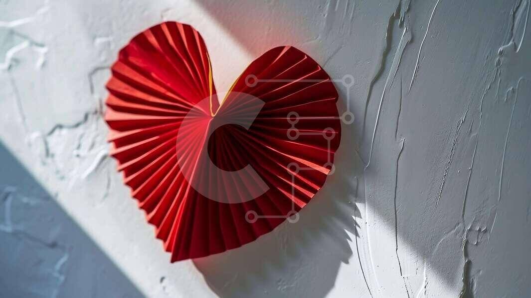 Υπάρχει δυνατότητα προσωποποίησης με δική σας φωτογραφία και προσαρμογής διαστάσεων κατόπιν παραγγελίας. Το συγεκεριμενο puzzle παρουσιαζει Αυτή η εικόνα παρουσιάζει μια όμορφα κατασκευασμένη κόκκινη χάρτινη καρδιά, σχολαστικά διπλωμένη σε πτυχωτό σχέδιο. Η καρδιά είναι τοποθετημένη σε ένα ανάγλυφο λευκό τοίχο, που ενισχύει το ζωντανό χρώμα της. Οι απαλές σκιές που ρίχνει η καρδιά δημιουργούν μια δυναμική αντίθεση