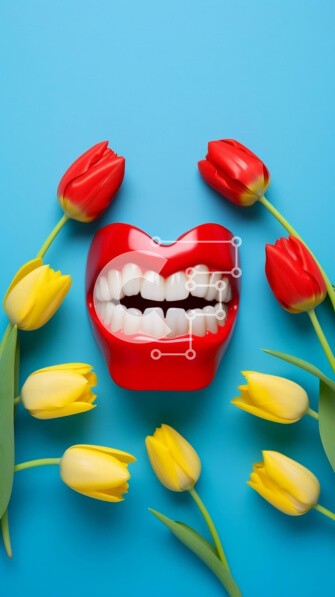 Υπάρχει δυνατότητα προσωποποίησης με δική σας φωτογραφία και προσαρμογής διαστάσεων κατόπιν παραγγελίας. Το συγεκεριμενο puzzle παρουσιαζει Αυτή η εικόνα παρουσιάζει ένα κόκκινο, πλαστικό στόμα που περιβάλλεται από κίτρινες και κόκκινες τουλίπες τοποθετημένες στο πρώτο πλάνο ενός μπλε φόντου, δημιουργώντας ένα εντυπωσιακό οπτικό αντίκτυπο. Πρόσθετα μικροαντικείμενα, όπως οδοντόβουρτσες και γλάστρες, είναι διάσπαρτ