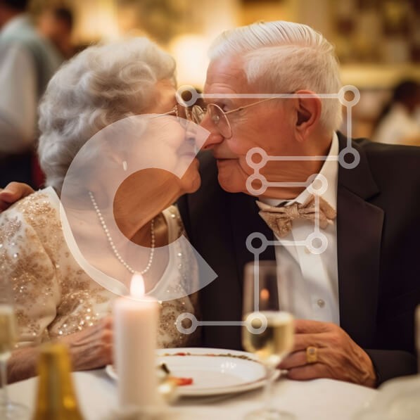 Υπάρχει δυνατότητα προσωποποίησης με δική σας φωτογραφία και προσαρμογής διαστάσεων κατόπιν παραγγελίας. Το συγεκεριμενο puzzle παρουσιαζει Αυτή η εικόνα παρουσιάζει ένα ηλικιωμένο ζευγάρι ντυμένο με επίσημη ενδυμασία να κάθεται σε ένα τραπέζι σε ένα φανταχτερό εστιατόριο. Ο άντρας γέρνει για να φιλήσει το χέρι της γυναίκας, ενώ εκείνη τον κοιτάζει με ένα χαμόγελο στα χείλη. Η ατμόσφαιρα είναι ζεστή και ρομαντική.